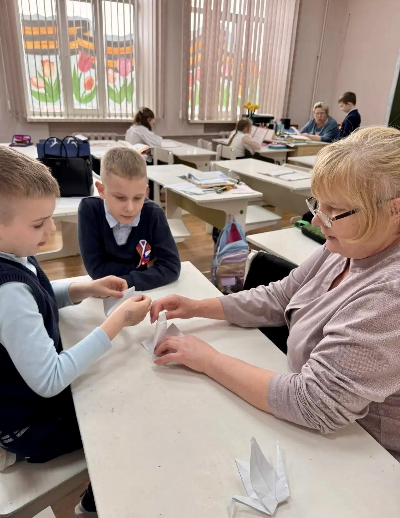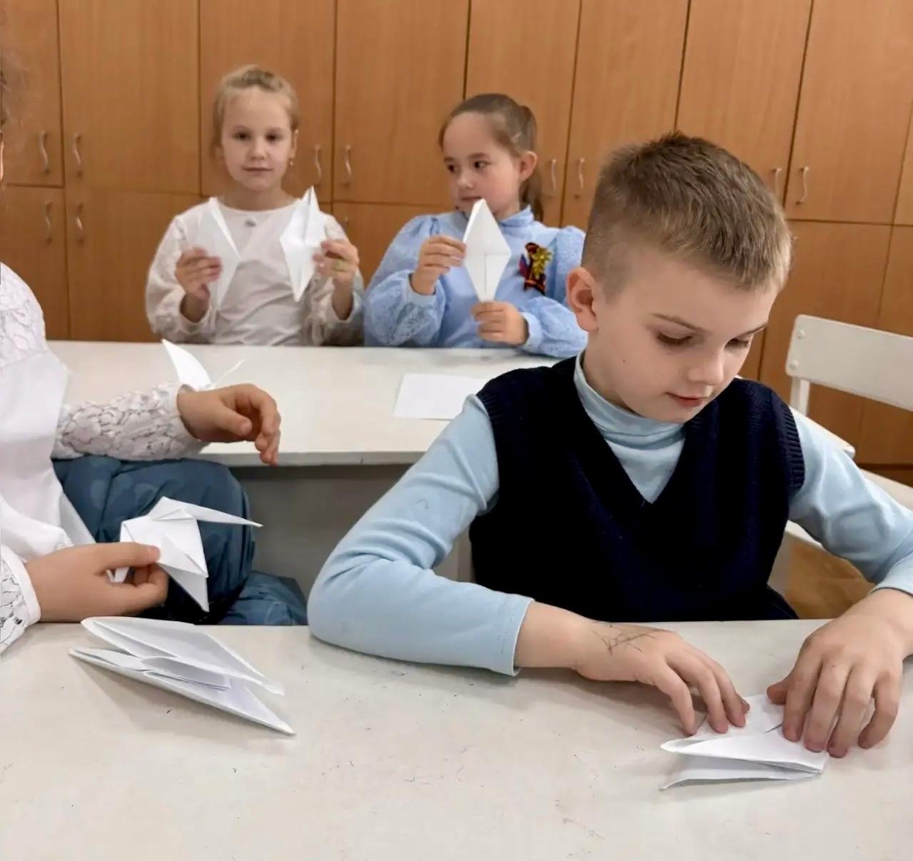 Ребята своими руками изготовили белых бумажных журавликов — символ бессмертия души, связи поколений и светлой памяти о героях ликвидаторах Чернобыльской АЭС.
